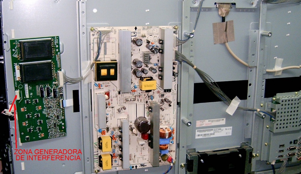 Este es un clásico LCD a tubos CCFL y por lo tanto tiene generador de back ligth a transformador de media tensión, ya que los tubos funcionan con tensiones eficaces de 2.500 a 3.000 V. Esta disposición es más que suficiente como para generar interferencias de todo tipo. Esa interferencia sale de cualquier componente del inverter como por ejemplo, transformadores de media tensión, conectores, cables o tubos y son captados sobre todo por la plaqueta T-COM, causando diferentes fallas de acuerdo a que sección de la plaqueta la capta. Como la plaqueta T-COM tiene dos secciones, la derecha y la izquierda puede ocurrir que la interferencia solo sea captada por una una mitad, dependiendo de la geometría del circuito impreso. La solución es mover los componentes con posibilidad de irradiar y observar si cambia la imagen en la pantalla. Nota: tenga precaución, porque es una zona peligrosa debido a descargas eléctricas. Para que Ud. pueda visualizar los componentes que pueden generar problemas le mostramos la disposición de la figura 14.2.