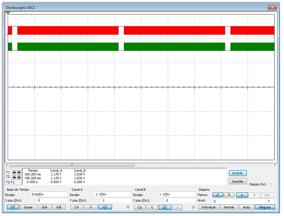 Para poder levantar los oscilogramas del circuito simulado tuvimos que realizar obligatoriamente un cambio fundamental en la frecuencia equivalente de los datos. Con el valor original de 68 MHz los pulsos de borrado vertical aparecerían en la pantalla cada ½ hora dependiendo de la velocidad de la máquina. Por eso bajé la frecuencia equivalente de datos a 10 KHz, pero la forma de señal que se ve en la pantalla sería la misma que si se utilizara la frecuencia correcta, salvo la separación entre los pulsos de borrado que aquí es más chica. En la figura 7.2.2 se puede observar la forma de señal resultante pero observe que tuvimos que correr una división hacia arriba el eje cero de la señal roja, porque sino la banda roja se superponía con la verde y no se llegaba a ver.