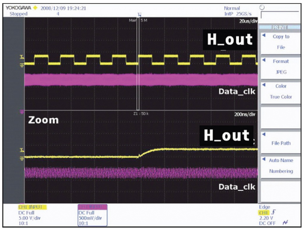 Arriba se observa la señal medida a una velocidad de barrido baja que permite observar la frecuencia de borrado horizontal que existe tanto como la vertical. A una base de tiempo de 20 uS se observa que esta frecuencia tiene un periodo de 24 uS y por lo tanto es de 1/24uS = 41 Khz. Con esta base de tiempos el clock es una banda violeta donde no pueden discernirse los datos individuales. En cambio usando una base de datos de 200 nS si se pueden observar y vemos que en 200 nS caben 15 ciclos lo que significa que cada ciclo dura 200nS/15 = 13 nS que corresponde a una frecuencia de 75 MHz.