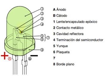 Fig. 1.1.1 Construcción interna de un LED Así que los científicos pensaron en resolver el problema definitivamente y como ya habían estado trabajando en un dispositivo muy prometedor, todos los laboratorios del mundo se abocaron a resolver en la práctica el diodo OLED, que tiene dimensiones adecuadas para el uso al que se lo deseaba destinar. Un OLED es un diodo led construido con materiales orgánicos (los derivados del carbono) que permiten construir moléculas muy finas (prácticamente del tamaño de 2 átomos de carbono) y de cadena muy larga (miles de átomos). Esto permite realizar puntos (dots) tan anchos como se desee y tan largos como se necesite uniendo cadenas moleculares. Inclusive cuando se trabaja con espesores tan chicos los dots resultan transparentes y se pueden encimar.