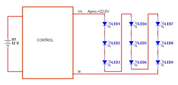 Fig.1.2.1 El circuito básico con limitación resistiva Como se puede observar a medida que se reduce el resistor hay que ajustar la tensión de fuente con más precisión para lograr la corriente deseada. Pero por supuesto que esto no es solución porque la tensión de barrera del diodo no es estable con la temperatura y la corriente circulante y por lo tanto la luz generada resultaría muy inestable. Los circuitos integrados driver de LED tanto para iluminación de ambientes y luces de emergencia como para TVs se basan en una fuente pulsada en donde la realimentación de error no se realiza directamente desde la tensión de salida. Sino que se basa en la corriente circulante por la cadena de LEDs mientras se va levantando la tensión de fuente por pasos. Estos driver son realmente circuitos inteligentes diseñados con un microprocesador para que el sistema consuma la menor energía posible y su funcionamiento debe relatarse paso a paso, porque si no entendemos como funcionan jamás los podremos reparar.