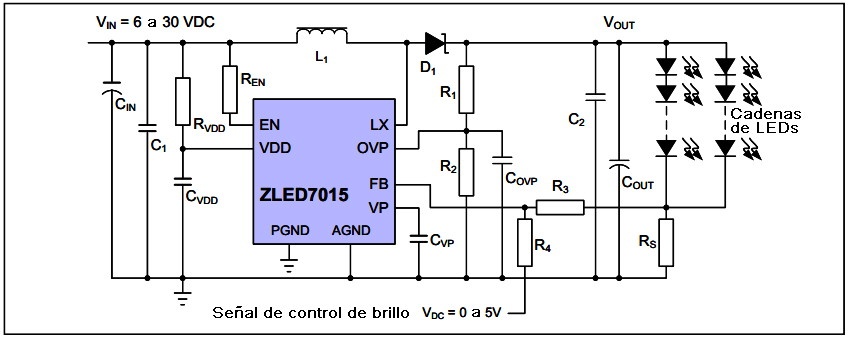 Fig.1.3.1 Circuito de aplicación del ZLED7015 Este circuito integrado puede alimentarse con tensión de entrada entre 6 y 30V y es capaz de entregar una corriente de salida pico de 80 mA generalmente distribuidas en 4 cadenas de 10 diodos. Las cadenas deben contener una cantidad igual de diodos y todos deben ser del mismo tipo y color (barreras lo mas similares posibles del orden de 2,5V a 3V). La fuente de entrada debe estar filtrada con un capacitor electrolítico de 100 uF (Cin) y un capacitor de tantalio de 1 uF (C1). La pata de encendido es EN de (Enable=habilitación) y en el circuito de aplicación se conecta con un resistor de 1K a la fuente de entrada para que el circuito arranque cuando se conecta la fuente. El circuito integrado requiere una alimentación en la pata VDD con su propio resistor (Rvdd) de 100 Ohms y su capacitor de filtro Cvdd de tantalio de 1 uF. El circuito integrado posee un MOSFET interno a masa sobre la pata LX para formar una fuente tipo fly-back con L1 y D1 como diodo auxiliar, que no es un zener como indica el circuito sino un diodo rápido de media barrera o diodo Schotky que alimenta a los dos capacitores de filtro Cout de 10 uF (electrolítico) y C2 (tantalio) de 1 uF. Sobre estos capacitores se obtiene la continua de salida solo que en este caso no está regulada por el divisor R1 y R2 como es habitual en una tipo fly back sino por la corriente circulante por la cadena de menor suma de barreras, que hace circular corriente por la resistencia shunt Rs. En ese momento la tensión Vout comienza a subir por pasos hasta que la corriente medida por Rs sea la prevista con Vdc en 2,5V. El terminal por donde entra la información de corriente es la pata FB (de Fedback = realimentación) y lo hace a través de R3 de 1K. La información que ingresa es una tensión continua debida a la corriente que circula por las 4 cadenas de LEDs. A esa información se le suma la señal de ajuste de brillo que proviene de R4 también de 1K. Si el driver es un dispositivo de iluminación la tensión Vdc proviene de un potenciómetro de control de brillo, en cambio si se trata de un TV o un monitor viene de una pata del circuito integrado escalador, que la genera analizando el contenido de brillo promedio de la imagen. El divisor R1, R2 que parece el divisor de ajuste de la salida es un sistema de protección de sobretensión. Observe que no está conectado como es habitual a la pata FB como en cualquier fuente Fly-back sino que está conectado a la pata OVP (de over voltaje protection = "protección de sobre tensión"). 1.4 CONCLUSIONES Así presentamos nuestra miniserie del LED al OLED que nos va a llevar varias entregas. En esta presentamos uno de los circuitos integrados driver de LEDs mas simples, pero no por ello menos efectivo. El ZLED7015 de la compañía ZMDI es un pequeño circuito integrado de 8 patas pero que puede controlar una gran cantidad de LEDs ajustando el brillo general de los mismos (0D). En la próxima entrega vamos a indicar como se repara una driver con este integrado y con todos los similares a él. Y vamos a explicar su funcionamiento más detalladamente y cuanta potencia puede entregar.