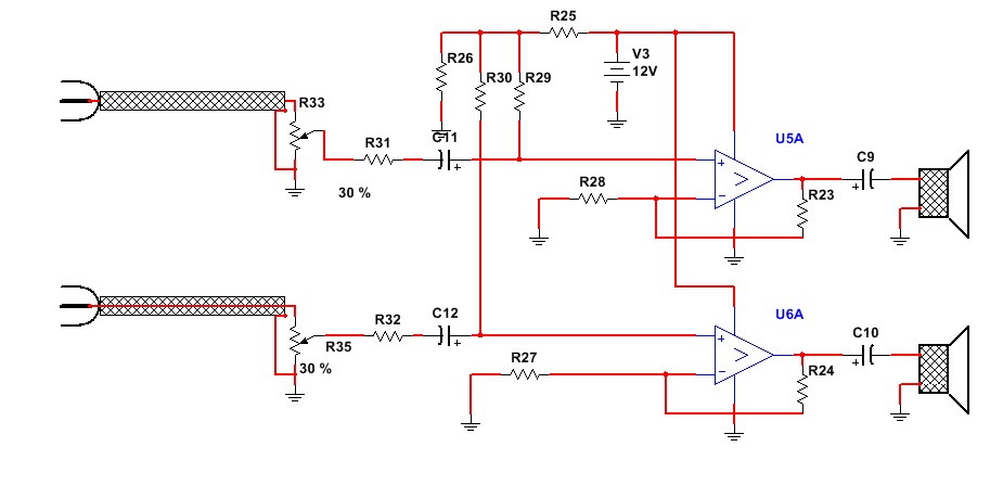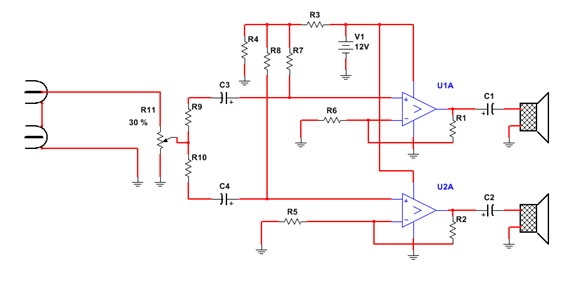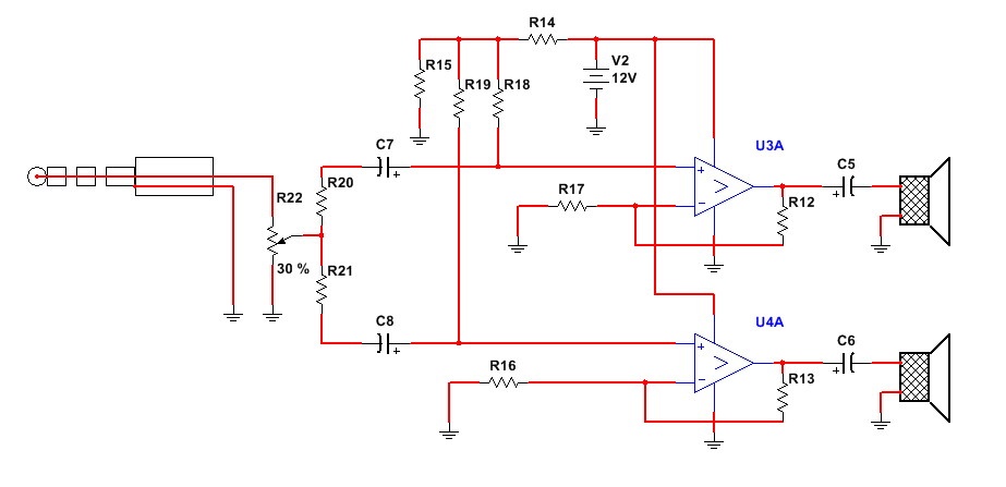 En efecto vemos que uno de los vivos de entrada está en el aire y que el otro alimenta al potenciómetro de volumen. La salida del potenciómetro está conectada a los dos amplificadores por R9 y R10.