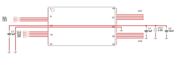 La pregunta de rigor es, donde se mide la tensión de fuente de la memoria flash paralelo. En la figura 10.2.1 dejamos claramente indicado donde están los puntos de prueba VSS (masa) y VCC (fuente de 3,3V).
