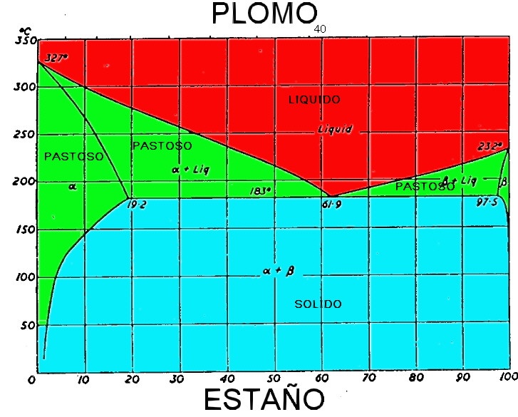 Lo interesante es que la temperaturas de fusión de los dos metales de la aleación son superiores a 186ºC. La metalografía nos explica que cuando los metales están aleados los atómos se relacionan de tal manera que hay electrones de ambos materiales que comparten núcleos comunes y es como si se formara un metal nuevo. Inclusive la temperatura de fusión depende del porcentaje de cada metal y hay una gama de temperaturas y otras características que pueden ser logrados. Las temperaturas de fusión están representadas en la figura 1.1.1.