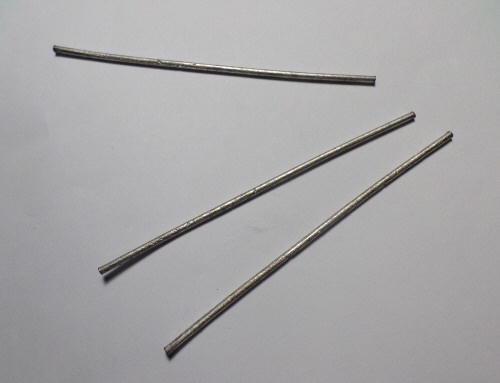 Finalmente decidimos modificar las fórmulas aceptando temperaturas de fusión más altas pero logrando que sean relativamente maleables, de modo de poder fabricarlas en forma de barrita cilíndrica de unos 2 mm de diámetro por 15 cm de largo, que consideramos como las dimensiones ideales. Ver la figura 1.3.1.