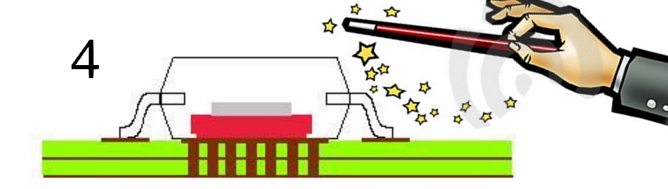 Nosotros requerimos que la Barrita Mágica llegue a la superficie de contacto entre la capa superior de cobre del circuito impreso y la isla disipadora del circuito integrado. El único modo de llegar allí con la barrita, es por los agujeros metalizados es decir que la primer parte de la operación es realizar un caparazón de barrita en la cara inferior que es una operación difícil de realizar porque se trata de una superficie disipadora que tiene una superficie grande.