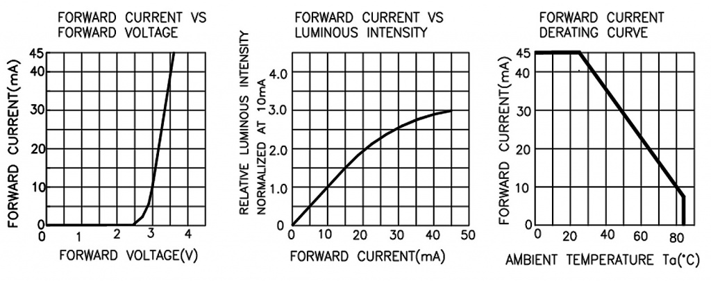 La primera curva nos indica cual es la caída de tensión que aparece sobre el diodo cuando circula una determinada corriente. En la central se observa la variación de la iluminación en función de la corriente y en la derecha lo que se llama la curva de "derating" o depreciación que nos indica hasta que temperatura ambiente se puede usar el diodo, sin causarle daño, en función de la corriente que circula por él.