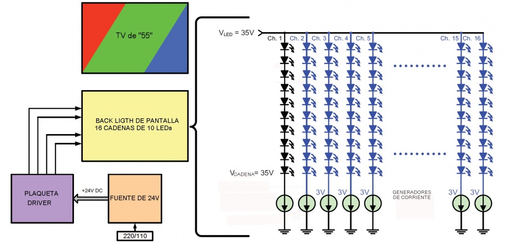 Observen que cada cadena termina en un generador de corriente encargado de manejar la corriente de back ligth manteniéndola fija en los casos en que el usuario usa el TV en la modalidad "Suave" o llevándola a un valor máximo o mínimo en el caso de la modalidad de video con control de brillo o contraste dinámico.