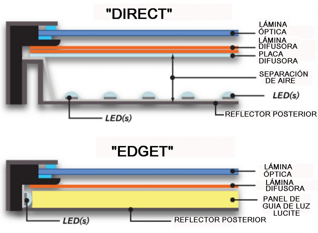 En el "Direct" la iluminación es perpendicular a la pantalla. La luz entra por debajo de la placa difusora, las láminas difusoras y la lámina óptica, para que no se observe más iluminación en la vertical sobre los SLED. Es evidente que toda la pantalla debe estar iluminada por una matriz de SLED.