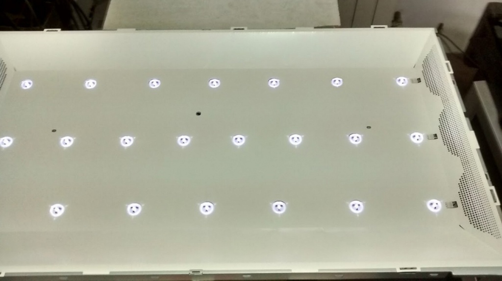 Hay un solo problema. Ahora tenemos dos SLED extras ya que cada tira de 8 provee un total de 24 SLEDs. Que haya más iluminación no es un problema sino una ventaja, pero la iluminación no va a ser pareja (por esa razón se usaban dos filas de 7 y una de 8 (en el diseño) de una sola cadena. La solución de este problema se logra distribuyendo los SLED en forma tal que provean una iluminación uniforme. Eso se puede observar a simple vista cuando se observa un caso de múltiples tiras poniendo el TV es SMART y usando el programa ITTNOKIAMONITOR con una pantalla blanca y poco brillo.