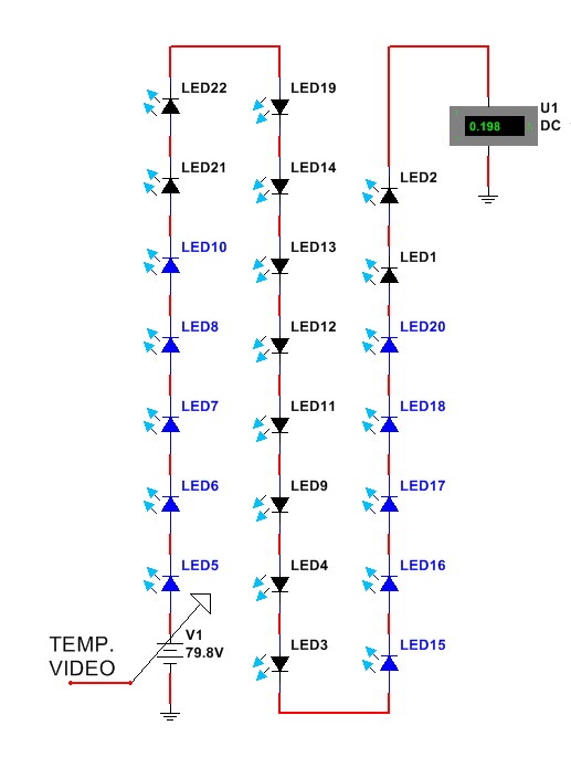 Como vemos este caso se resolvió con tres líneas de SLED con una matriz asimétrica de dos líneas de 7 SLED arriba y abajo y una línea de 8 en el medio. Esto evidentemente mejora la uniformidad de la iluminación que se conseguiría utilizando 3 líneas iguales por ejemplo de 8 SLED. El hecho es que si usamos un múltiplo de tres nos permite elegir entre diferentes circuitos. Por ejemplo 3 cadenas de 8 o 6 cadenas de 4 o una cadena de 22. En este último caso se requieren tensiones de fuente de aproximadamente 24V para cadenas de 8 SLED, 12V para la cadena de 4 SLED o 66V para una sola cadena de 22 SLED.