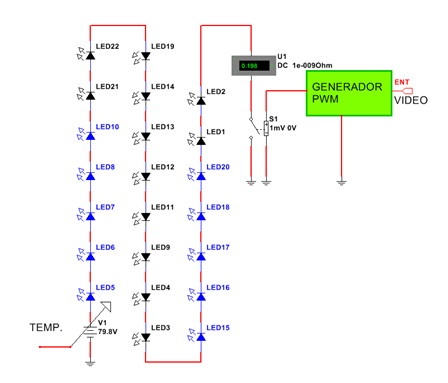 Como se puede observar para controlar una cadena de SLED se requiere una etapa driver de SLED que controle la corriente circulante por ellos con dos variables. Una es la tensión de barrera de los SLED que varia con la temperatura de los mismos y la otra es la señal de video que se está reproduciendo, por si el usuario seleccionó un tipo de back ligth dinámico controlado por el video. El circuito se modifica según la figura 1.5.3.
