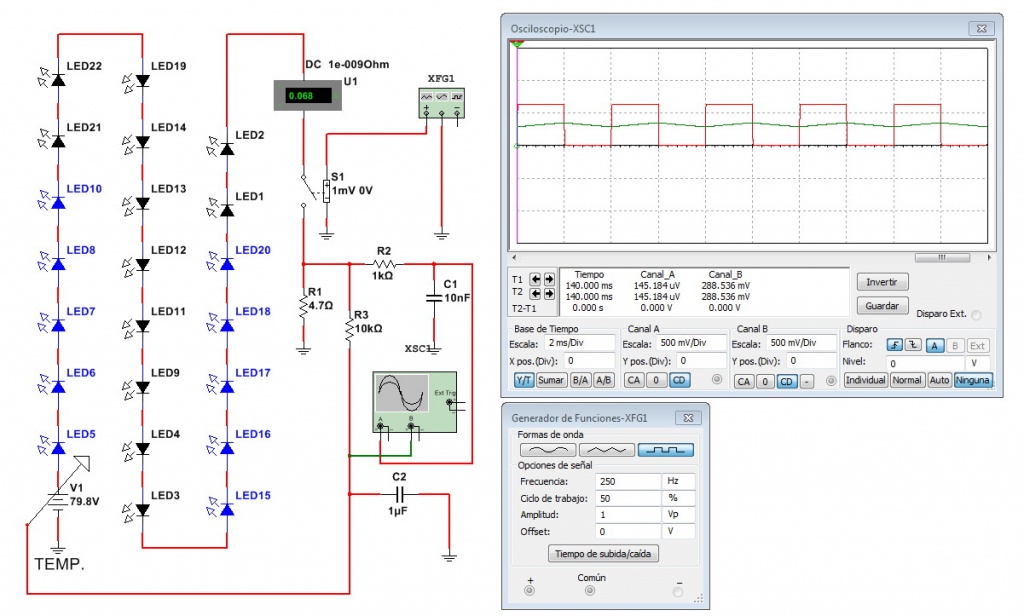 El circuito permite variar levemente la tensión de fuente y ampliamente el periodo de actividad de la corriente lo cual equivale a una variación proporcional del brillo de los SLED.