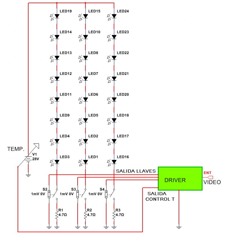 Es decir que la fuente para alimentar a las cadenas no es fija sino que debe variar para que por cada cadena circule la corriente adecuada. Este posible circuito no se utiliza nunca. Porque equivale a realizar una fuente de corriente analógica que siempre es de bajo rendimiento y que no tiene en cuenta un dato importantísimo; la curva del SLED varia con la temperatura como cualquier otra tensión de juntura. Es decir que hay que variar la tensión de fuente de acuerdo al brillo deseado y además de acuerdo a la temperatura y no a la ambiente sino a la temperatura de juntura de los SLED de la cadena considerada. Esto es muy complicado y en realidad no se usa. Ver el circuito de la figura 1.5.2.