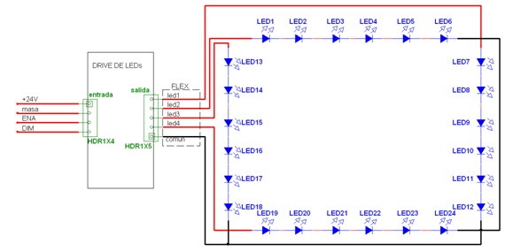 Por lo general los TV tienen la plaqueta driver separada y conectada a la plaqueta principal a través de un flex y conectores de borde, de modo que todas cadenas llegan hasta la plaqueta driver con el ánodo del último diodo y tienen el cátodo del primero conectados a un cable común. Ver la figura 3.3.1.