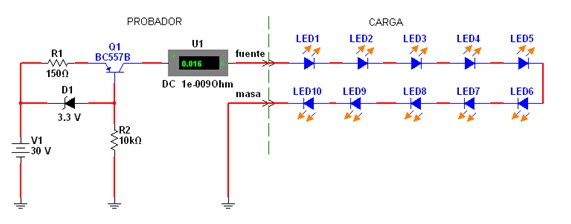La idea es alimentar individualmente cada cadena de LEDs, pero debemos estar seguros de hacer circular una corriente de 20 mA como máximo. Como ya utilizamos una fuente de 0 a 30V para la prueba de la plaqueta driver, debemos realizar un circuito que funcione con la misma fuente tal como mostramos en la figura 3.4.1.