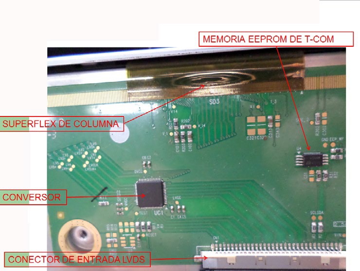 Sobre todo, lo relacionado con la pantalla tiene una gran dificultad; la falta absoluta de información, que nos obliga a trabajar haciendo ingeniería inversa de lo que antes llamábamos plaqueta T-COM. La plaqueta T-COM ahora está incluida en la pantalla sin posibilidad de cambio de plaqueta. La entrada no sufrió cambios con respecto al LCD con tubos CCFL o ECFL sigue siendo un conector para un flex, que trae información digital de video en uno o dos puertos digitales y la tensión de alimentación de 12V, para la sección de la T-COM dedicada a generar las tensiones de fuente de la pan¬talla. Pero la salida, generalmente con dos puertos digitales y las fuentes, ya no terminan en un conector. Ahora es el borde de un flex que va pegado con adhesivo conductor, a la plaqueta por un lado y a la pantalla por otro. Las columnas y las filas de la pantalla, ya no tienen acceso desde el exterior, porque los circuitos integrados de filas y de columna están incluidos en la pantalla, impresos sobre el vidrio o dentro del flex.