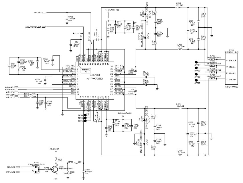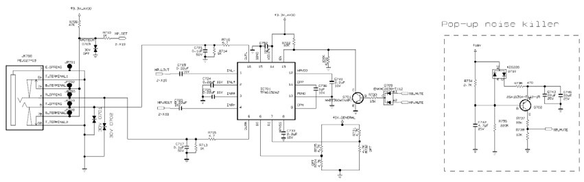 Todos los TV LED actuales, suelen funcionar con señales de audio digitales desde las entradas hasta las salidas del amplificador digital. Solo se pueden observar señales de audio analógico sobre los parlantes. Todo el procesamiento de audio del TV, que tomamos como referencia, se realiza sobre el circuito integrado NTP7250 para los parlantes y el TPA6132A2 para la salida de auriculares. Este circuito integrado de auriculares es totalmente analógico, desde la entrada hasta la salida, obteniendo sus señales de entrada desde el superjungla con micro. Esto quiere decir que el superjungla con micro tiene los dos tipos de salida de audio; a veces se utilizan las dos como en el modelo de ejemplo y a veces solo la digital, cuando el amplificador de auriculares tiene entrada digital o cuando los auriculares se conectan a la salida de parlantes.