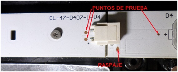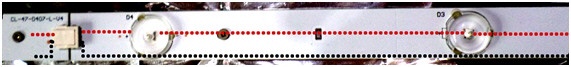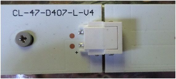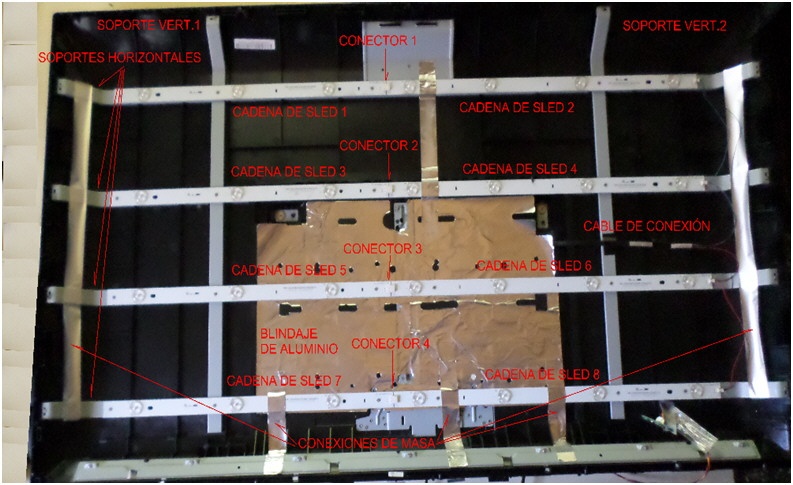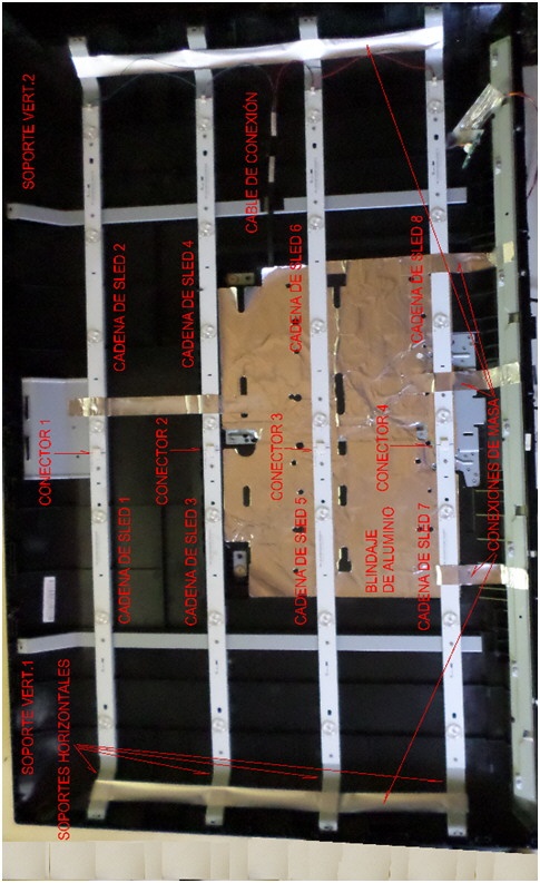 En esta vista general podemos observar la existencia de 4 tiras horizontales compuestas por dos partes unidas por conectores centrales. Es decir que este TV usa dos tipos de cadenas de 4 y de 5 LED que se conectan entre sí por un conector de borde de dos patas que mostramos a continuación en la figura 10.2.2.