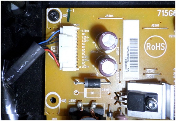 El problema de nuestro TV era que no encendía el back ligth ni siquiera daba un flash y se apagaba o por lo menos eso es lo que apreciaba el cliente y lo que apreciamos nosotros al mirarlo. Lo probamos encendiendo varias veces y nunca generaba imagen, pero si generaba sonido, que nos permitía reconocer que la sección de control funcionaba correctamente, es decir cambiaba de canales, ajustaba el volumen, etc. Desde luego que para hacer esta prueba el TV debe estar en cable o aire y esto se reconoce porque los parlantes generan el clásico ruido blanco si no colocamos señal alguna. Si esto no ocurre apriete la tecla sources del control remoto. Pero antes de desarmar la pantalla que es un trabajo de varias horas hay que confirmar que el driver de LED o la carga (la/las cadenas de SLED) funcionen correctamente. Y lo primero que hay que hacer es mirar el conector del back ligth porque él nos indica la cantidad de cadenas que tiene el sistema. En la figura 10.1.1 mostramos una fotografía del conector y la parte de la plaqueta de fuente correspondiente al drive de SLED.