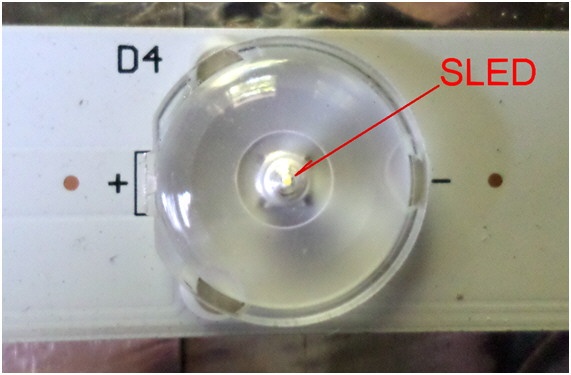 Los conectores no son necesarios más que para el posible procesamiento de fabricación de los flex con los SLED. Ya que el largo del flex para una pantalla de 50" hace difícil el procedimiento de armado automático y soldadura. Todos los componentes incluyendo estos conectores son SMD y se sueldan por calentamiento por contacto con la cara inferior del flex. Este flex es evidentemente del tipo de fibra de vidrio que soporta las temperaturas de fusión del estaño puro (225 ºC) llegando a soportar hasta temperaturas de 350ºC sin dañarse. En total se observan 36 LED pero como esa es una cantida muy pequeña podemos suponer que se trata de SLED de 6V que en realidad contienen 2 SLED en su interior de este modo la tensión de cada cadena será de 9 x 6 = 36 V aproximadamente que en realidad a la corriente de trabajo suele medir unos 45V. En la figura 10.2.3 se puede observar el SLED debajo de su lente dispersora.