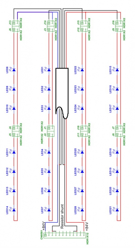 Para poner cadenas en paralelo se requiere utilizar SLED con barreras seleccionadas armar las cadenas y seleccionarlas después para que tenga una barrera conjunta idéntica. De hecho hay varios fabricantes de SLED que seleccionan diodos y otros fabricantes de cadenas, que las seleccionan por categoría luego de armarlas. El fabricante (y sobre todo si tiene una gran producción) no tiene problemas. El problema es para nosotros si tenemos que hacer una reparación por un diodo quemado. Por lo común los TV de 4 cadenas las conectan independientemente con un resistor shunt para cada cadena. Allí, si se quema un diodo por lo general el TV sigue funcionando, salvo que se abra. En ese caso se lo puentea y a lo sumo se reajusta el resistor shunt. Si se trata de un sistema de cadena única hay menos problemas aun porque la pérdida de iluminación de un solo SLED prácticamente no se nota.