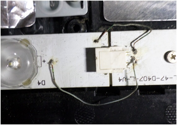 Lo primero que se nos ocurrió hacer, al realizar la prueba con el probador de cadenas de SLED fue apretar los flex y ambas cadenas fallaban al apretar sobre el conector de unión. En principio pensamos que se trataba de un falso contacto en los conectores así que destornillamos uno de los flex fallados y abrimos las dos partes, pero la limpieza con limpiador de contactos para PC no mejoró el problema, luego no dimos cuenta que el problema era la soldadura SMD de las patas. Es decir una falla de fabricación a pesar de que el TV tenía varios años funcionando.