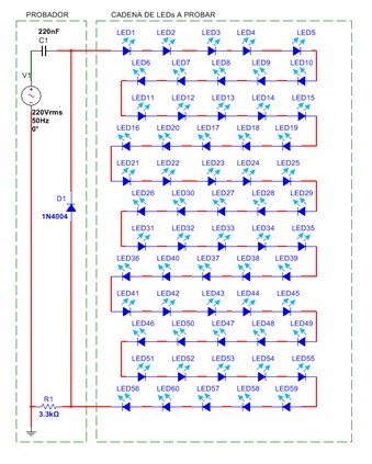 Un probador de LEDs debe tener un componente que limite la corriente que circule por los mismos, porque si conectamos la/las cadenas directamente a la red, se quemarían por exceso de corriente ya que la misma solo quedaría limitada por la resistencia interna de los LEDs.