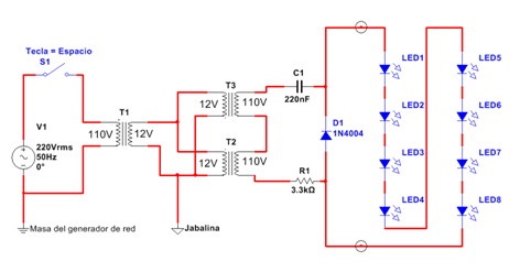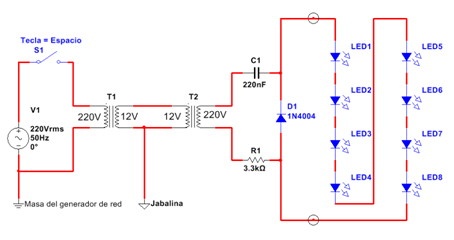 En los circuitos se observan dos conexiones de tierra. La conexión de tierra de la compañía que ingresa con el cable neutro de la red y la jabalina local de puesta a tierra que debemos colocar obligatoriamente en nuestra red de alimentación interna. La conexión a la jabalina nos garantiza que todo nuestro dispositivo de prueba esté conectado al planeta tierra con doble aislación provista por el transformador de entrada y el/los transformadores de salida, para que un contacto accidental a los LEDs no los pueda quemar por sobretensión.