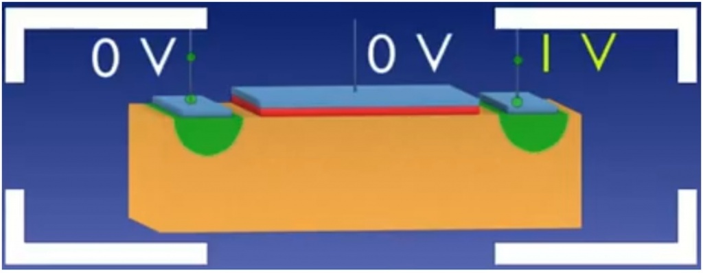 En los dibujos se observan tensiones de 0V y de 1V pero esto solo es una representación de estados alto o bajo. Las tensiones normales son de 0 y 3,3V. El terminal de fuente y drenaje van a tener un potencial que depende del estado del gate. Si el gate tiene un potencial superior a 3,3V el gate cierra el camino de circulación electrónica entre drenaje y fuente y el transistor conduce a pleno. Es decir que se comporta como una llave cerrada y por lo tanto no puede haber caída de tensión sobre él. La tensión del drenaje referida a fuente es prácticamente igual a cero. Podemos decir que la memoria guarda un cero.