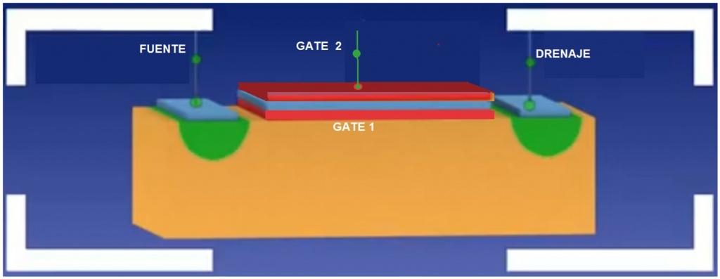 En sus puntas se difunde un material tipo "N altamente dopado" dibujado en verde y sobre él se realiza otra vaporización metálica que sirve para soldar los terminales llamados "fuente" y "drenaje".