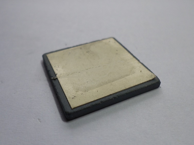 Fig.1.1.1 Fotografía del disipador El encapsulado del micro tiene un tamaño de 22,54x 22,54 mm es decir que el disipador sobresale 3,75 mm del encapsulado. Sacando alguna cuentitas el disipador es un 24% más grande que el microprocesador. Como hay una caída de temperatura en el adhesivo térmico entre el microprocesador y el disipador y en el disipador cerámico. Podríamos decir que prácticamente no contribuye a reducir la temperatura del microprocesador, siendo este uno de los principales problemas de este modelo. Dado su bajo peso, el disipador puede ser pegado con un equivalente de la grasa siliconada, que es más densa y permite una presentación en forma de estampilla de doble faz, lo que facilita su colocación en la plaqueta como paso final luego del armado (trabajando a mano descubierta). Ver la fotografía del lado adhesivo.