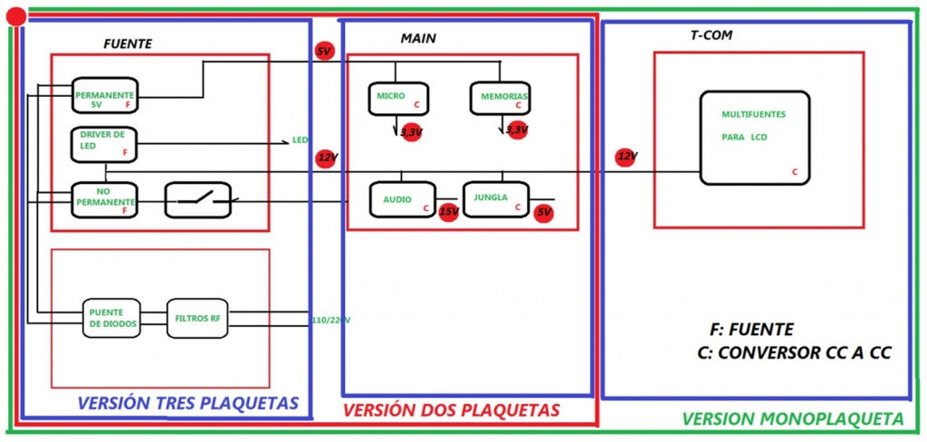 En realidad sin conocer detalles de funcionamiento de las fuentes y los conversores CC a CC se puede hacer mucho para encontrar el conversor o la fuente fallada, partiendo de la figura 1. Primero porque en esa misma figura encontramos las tres versiones de la disposición interna de plaquetas. Por ejemplo en azul tenemos los modelos más antiguos (generalmente LCD con tubos CCFL) con tres plaquetas o tal vez cuatro porque la plaqueta driver podía ser tan compleja que era una unidad separada. En rojo tenemos la versión de dos plaquetas y en verde la monoploaqueta.