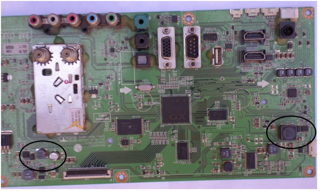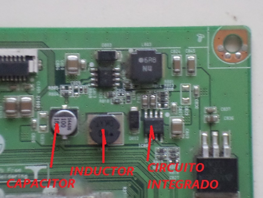 Esta asociación de componentes nos guía hasta un posible conversor CC a CC y la medición sobre el/los capacitores electrolíticos o cerámicos multicapa que indique 0V, cuando el TV fue encendido, nos confirma que es el conversor CC a CC de audio que debe ser reparado. En la figura 2 mostramos una plaqueta donde señalamos los posibles conversores CC a CC.