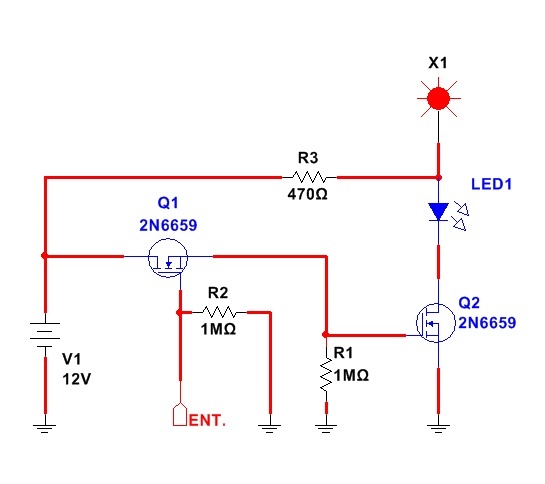 ![]() FIG.2.1 Circuito simplificado de una celda Pa rtimos de un minúscula varilla de silicio puro de sección rectangular cuyo nombre es substrato. El substrato es la base sobre la que se construye el MOSFET y es silicio en su máximo grado de pureza (que por lo tanto es un perfecto aislador). En sus dos puntas superiores se produce un enriquecimiento muy grande de material de silicio tipo N. Esto transforma al silicio aislador en un material que tiene una pequeña resistencia especifica y sobre la cual se montan los terminales de fuente y drenaje. De este modo el centro de la varilla queda despojado de electrones y por lo tanto es un aislador perfecto. Esta varilla se aísla por oxidación (la oxidación del silicio da por resultado el vidrio que es el mejor aislante que se conoce luego de la cerámica). En el transistor MOSFET común se produce una metalización sobre la cara aislada superior de la varilla que atrae electrones y cierra el canal para que conduzca como lo indica la flecha verde. Para que conduzca el canal se ponen cargas positivas en la compuerta. Cuando se quitan las cargas el canal se abre. Y así tenemos el estado conductor al que le asignamos un valor 1 y el estado aislador al que asignamos el valor 0. Un MOFET común de cualquier tipo es una memoria si le aplicamos una fuente de 5V a la compuerta con un pulsador. Ver la figura 2.2.