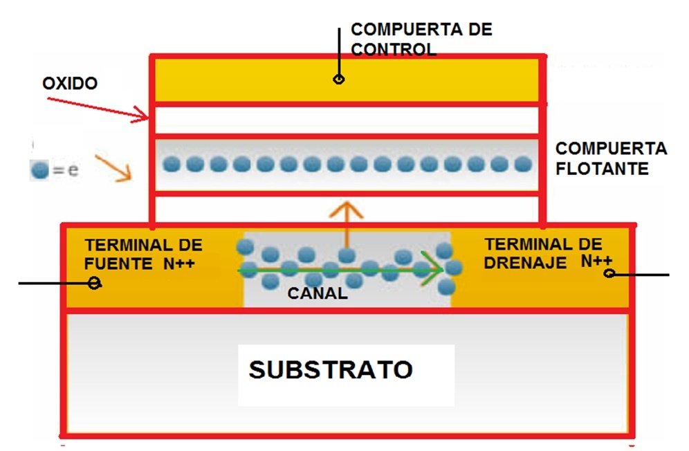 PARTE B PORQUE SE QUEMAN LAS FLASH Mientras esperamos que vengan las Flash del Samsung, no está mal saber porque se queman y cómo funcionan cuando no están dañadas. Cualquier tipo de memoria no es más que un conjunto de celdas de memoria, organizadas según un criterio adecuado, para guardar los datos del dispositivo en donde están funcionando. Hay muchos dispositivos diferentes que pueden operar como celda de memoria (en definitiva son llaves electrónicas que memorizan la última condición de cerrada o abierta). Todas se comportan de un modo similar. Una memoria siempre termina siendo una llave que se conserva abierta o cerrada todo el tiempo que deseemos. Algunas inclusive conserva su estado abierto o cerrado aunque se desconecte la fuente del dispositivo que la contiene. De todos los tipos de llaves de memoria nosotros vamos a estudiar los más modernos que son las que integran las memorias Flash. Por si no le quedó claro el equivalente mecánico de una memoria electrónica, es la simple llave de iluminación de su habitación. Ud. la opera y la llave se cierra y la lámpara enciende. Si no la toca la lámpara se mantiene en esa condición de encendida hasta que Ud. la vuelva a operar y apague la luz. si la deja en esa posición la habitación permanece a oscuras todo el tiempo deseado. Las memorias Flash se usan en diferentes dispositivos de los cuales los más conocidos son los Pendrive, los discos rígidos de estado sólido y por supuesto los TVs. Las llaves usadas son en todos los casos transistores MOSFET modificados. Tienen tres patas como todos los MOSFET y dos son las clásicas "drenaje" y "fuente" conectadas a un canal clásico tipo "N". El cambio está en el dispositivo de control o compuerta, ya que tenemos una clásica compuerta con conexión al exterior para el comando del canal y otra compuerta llamada "flotante" que no tiene conexión externa. Es una simple metalización totalmente aislada del resto del mundo. En la figura 2.1 mostramos un dibujo simplificado de una celda.