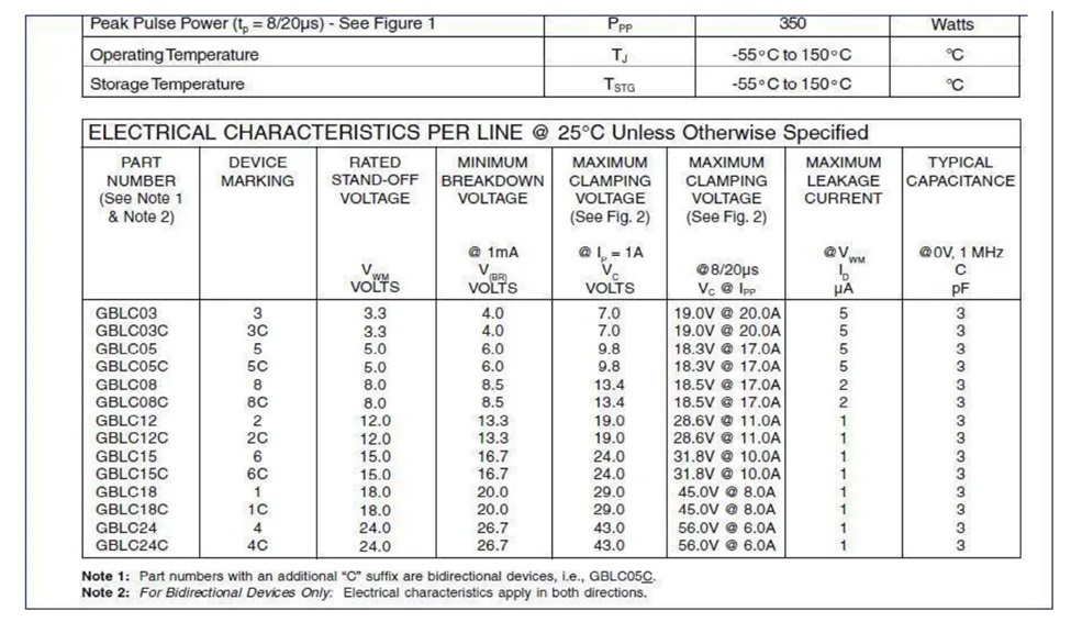 Como vemos la especificación indica que es un zener de 12V pero de una capacidad inversa de solo 3 pF lo que lo hace apto para ser utilizado como diodo protector. Si analizamos los datos de las especificaciones observamos que debe haber algún error porque armando el circuito se observa que la protección opera a valores demasiado bajos que no permiten alimentar una serie de 8 diodos de 3V que es lo clásico de una fila de un TV de 32".