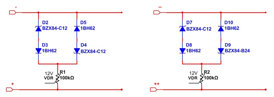 En azul esta el marcado como 4E y en negro el marcado como "2". La figura muestra el circuito protector de la izquierda según las especificaciones y a la derecha lo que yo considero más adecuado. En efecto el circuito de la izquierda tiene una tensión de conducción de 24,6V que es demasiado baja. A la derecha modificamos el circuito con un circuito protector de 24V con lo cual la protección comienza a los 36,6V.