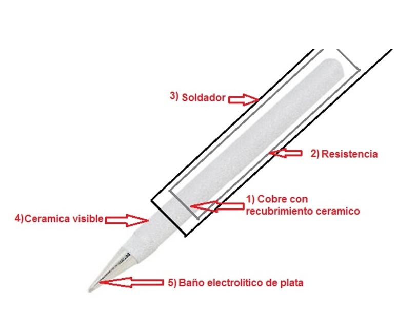 La punta en si (1) es un cilindro de cobre recubierto de cerámica, con una terminación cónica. El cobre es muy buen conductor del calor y la cerámica es un aislador del calor (pero no muy bueno) y de la electricidad. Un poco después de comenzar el cono se produce un baño (los fabricantes aseguran que es plata). Allí es donde se puede fundir la soldadura en alambre, quedando cargada sin oxidarse, si todo está a la temperatura correcta. El alambre de soldadura se une perfectamente con la plata y puede formar una pequeña bolita allí porque el estaño y el plomo son estructuralmente compatibles con la plata.