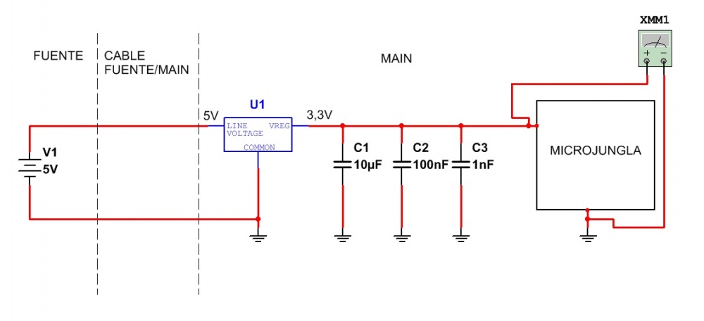 ¿La masa, no la podemos tomar en alguno de los tornillos de la plaqueta?. Sí, pero no sabemos si esa masa llega hasta el micro. Lo más común es tratar de encontrar el triple banco de capacitores. El circuito de alimentación del micro es forzosamente muy particular y no siempre es el mismo para todos los TVs. De la fuente pueden salir tanto 5V como 3,3V aunque el micro siempre es de 3,3V. Esto parece una estupidez porque no parece tener sentido generar 5V y reducir luego a 3,3V ¿porqué no generar directamente 3,3V en la fuente? Porque el consumo de un micro es lo mas variable que hay en el TV. ¿Mas variable que el consumo del audio de potencia? No, pero es posible que la variación de máximo a mínimo consumo sea muchísimo más rápida y genere pulsos muy finos en el cable que va desde desde la fuente hasta el micro. Eso se puede solucionar de dos modos diferentes. Generando 3.3V en la fuente y colocando un banco de capacitores sobre el micro o generando 5V y colocando un conversor continua a continua de 5 a 3,3 cerca del micro. Estos conversores deben ser capaces de mantener la salida de 3,3V limpia solo con un capacitor de cerámico multicapa SMD de 10 uF. En el audio de potencia podría existir un aumento que tarde 50 uS (señales de hasta 20 KHz ) y en el micro el aumento de consumo puede producirse en 20 nS. Para que no se produzcan pulsos sobre las componentes inductivas de la fuente se requiere un banco de capacitores generalmente de 10 o 20 uF (multicapa) en paralelo con 100 nF y 1nF. Ver la figura 2.2.1.