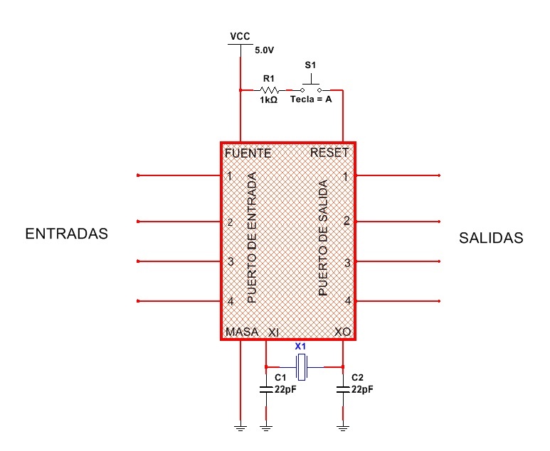 Por supuesto que no vamos a dar aquí una explicación profunda sino solo lo imprescindible, para explicar luego como se diseña un programa. La síntesis más absoluta de un micro es un dispositivo con patas de entrada y de salida por ejemplo 4 y 4.
