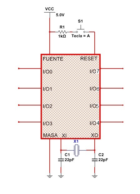 Observe que el cristal se conecta a las patas llamadas XI (XInput = entrada de cristal) y (XOutput : salida de cristal). El terminal XO es de baja impedancia y puede utilizarse para excitar algún circuito externo que requiera esa señal.