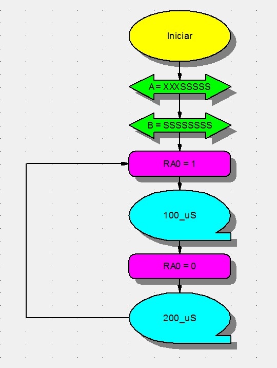 Lo primero que hace el programa automáticamente es colocar el bloque "Iniciar" cuando abrimos un nuevo programa. Luego, si el lector recuerda, decíamos que los micros actuales eran enmascarables, es decir que las patas podían elegirse como de entradas o salidas. Eso lo realizan los bloques de doble flecha en donde se indica si una pata será de entrada o salida.