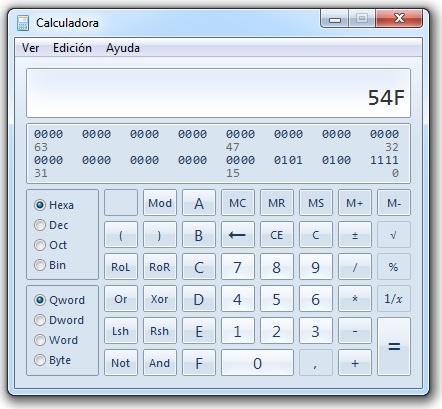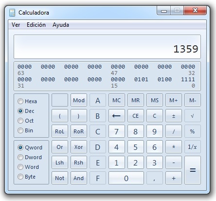 Vamos a hacer una transformación de un número decimal a un binario y al correspondiente hexadecimal. Les aviso que hay una fórmula matemática bastante larga que puede realizar estas transformaciones, pero mucho más fácil es tomar la calculadora de la PC ingresar en "VER" y seleccionar "PROGRAMADOR". Allí aparece la calculadora en versión "programador" que vemos en la figura 5.2.1. Allí seleccionamos decimal y ponemos un numero cualquiera como por ejemplo 1359. Como vemos para este número se requieren 4 cifras.