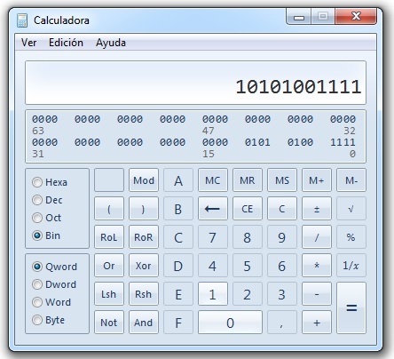 Lo más importante es que solo necesitamos 3 dígitos para representar el mismo número. Y por último corremos el punto azul de la calculadora a binario y obtenemos 10101001111 en el visor; es decir que necesitamos 12 dígitos.