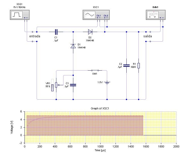 $v1 1.1 INTRODUCIÓN El tester digital o analógico es el instrumento de batalla del reparador. Como la espada del guerrero es lo primero que desenfunda. Luego si con la espada no basta sacará a relucir armas mas sofisticadas como un osciloscopio. Pero nuestro tester tiene un uso limitado. Cubre CC y CA hasta quizás 1 KHz con mucha suerte. Si Ud. arma un sencillo circuito de interface la espada se potencia de modo que puede cubrir mediciones desde 10 KHz hasta 5 GHz (con dos o tres sondas diferentes) permitiendo una variedad de mediciones solo limitadas por nuestra imaginación. Osciladores a cristal, señales RF de CD o de DVD, FE, TE, VE de reproductores de CD y DVD y un etc. muy grande porque todos los días le encontramos una nueva utilidad. Y a medida que realizamos nuevas sondas este articulo se va poblando de apéndices. Como el estetoscopio del médico. Este conjunto de sondas es como para llevarlas colgadas del cuello. Realmente yo las tengo acoplada a diferentes testers de aguja de esos que valen 2 U$S y creo que es el conjunto de instrumentos caseros que mas satisfacciones me dio. 1.2 SONDA DETECTORA DE RF Por ejemplo, todo lo que se necesita para saber si en el bus de datos hay una señal adecuada es un detector de señal de CA de 5V pico a pico. Usar el tester en CA no sirve para nada. Los tester pueden medir CA de 50Hz y en muchos casos si no tienen componente continua agregada. Nosotros vamos a usar el tester en CC y por lo tanto debemos agregar entre el tester y el circuito, una interface adecuada construida con diodos que puedan funcionar hasta varios cientos de MHz para obtener un instrumento versátil que sirva para otras funciones además de leer un bus de datos. En la figura 1.2.1 se puede observar un circuito simple, que puede montarse dentro de una jeringa hipodérmica para medicina veterinaria con dos cables de salida para conectar al tester con dos fichas banana. ![]() Fig.1.2.1 Circuito de la sonda detectora de RF En la figura se observa el circuito de la sonda conectada a un generador de funciones y a un osciloscopio para verificar su funcionamiento con una señal rectangular de 5V, 50 KHz. Como resulta obvio, el único instrumento imprescindible es el tester conectado sobre la salida del circuito, que puede ser tanto un instrumento analógico como digital de cualquier característica. Observe que se trata de un detector de valor pico a pico construido con dos diodos 1N4148. De ese modo las dos señales del bus de datos va a dar una indicación de aproximadamente 5V si el dispositivo funciona correctamente. Observe que la sonda incluye una pila de 1,5V y un preset para prepolarizar los diodos y evitar el error de la tensión de barrera de los mismos. Como el detector pico a pico tiene un capacitor de entrada nuestro circuito no responde a las tensiones continuas y por lo tanto no nos engaña si el bus de datos está permanentemente en 5V o si la salida de un cristal tiene una continua superpuesta. Antes de medir se deben compensar las barreras del siguiente modo: ponga la entrada en cortocircuito, ajuste el preset a través del agujero de la jeringa para que el tester digital indique aproximadamente 40 mV en la escala de 1V. Retire el cortocircuito y mida. Esta sonda está diseñada para que funcione entre 10 KHz y 100 MHz y es por lo tanto ideal para medir la señal RF de reproductores de CD o de DVD y la señal de oscilación de cristales dentro de esa gama de frecuencias. Inclusive sirve para medir señales de horizontal como la tensión de filamento del tubo y otras. Aumentando el valor de los capacitores a 10 uF (electroliticos) se la puede usar en audio, pero no conveniente usar una sola sonda para toda la gama hasta 50 MHz. Fabrique dos y recuerde que los diodos 1N4148 solo soportan 50V. Si desea construir una sonda que soporte mas tensión debe emplear diodos auxiliares de TV o diodos recuperadores y por supuesto utilizar capacitores y resistores de adecuada tensión. Tenga en cuenta que el error de lectura de esta sonda puede ser del orden de los +-100 mV dependiendo de la precisión de su ajuste. Es decir que sin ser un instrumento de precisión resulta útil para la mayoría de nuestras necesidades. En la figura 1.2.2 se puede observar el diseño de una plaqueta de circuito impreso para armar la sonda dentro de una jeringa hipodérmica de 40 mL. Tanto el circuito eléctrico como el impreso fueron realizados en el laboratorio virtual Live Wire y son perfectamente funcionales. Si el lector desea los archivos electrónicos de este dispositivos se debe comunicar por correo electrónico con el autor. ![]() Fig.1.2.2 Plaqueta de la sonda detectora de RF En la tabla de la figura 1.2.3 se puede observar la lista de materiales del dispositivo. ![]() Fig. 1.2.3 Lista de materiales de la sonda DE 10Khz a 50 MHz En la figura 1.2.4 le mostramos el dispositivo terminado. Observe que se utiliza la misma aguja hipodérmica como punta (cuando no use la sonda cúbrala con el capuchón de plástico). Para conectar la aguja a la plaqueta simplemente busque un alambre estañado que entre justo en la aguja y apriete levemente con el alicate sobre la misma como si fuera a cortarla, para deformarla y realizar un contacto franco. Si necesita desarmar el dispositivo tire de la aguja rompiendo el alambre y luego coloque un alambre y una aguja nueva. El soporte de la plaqueta es el propio embolo de goma de la jeringa con una ranura para encastrar la plaqueta. La pila esta directamente soldada al impreso porque el consumo es muy bajo y dura muchas horas de uso. ![]() Fig.1.2.4 Aspecto exterior de la sonda armada 1.3 USO DE LA SONDA DETECTORA DE RF PARA MEDIR UN BUS DE DATOS Vamos a utilizar la sonda para medir la existencia y la amplitud de las señales de data y clock del sintonizador. Si Ud. le pide a un TV que realice el ajuste automático de canales y cuando termina no le quedó ningún canal sintonizado es muy probable que falle la comunicación entre el micro y el sinton