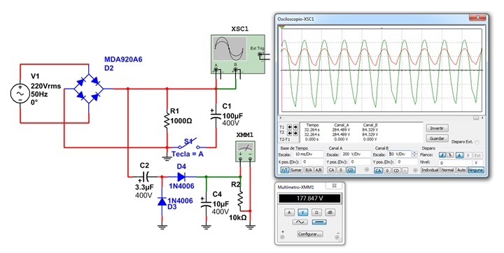 El circuito del TV solo contiene al puente y el capacitor C1. R1 representa la carga de un TV de 32 o 42". El resto de los componentes es para analizar nuestro problema. Por ejemplo la llave S1 se agregó para simular el circuito con el capacitor abierto por completo, caso que por lo general nunca ocurre; siempre reducen algo del ripple.