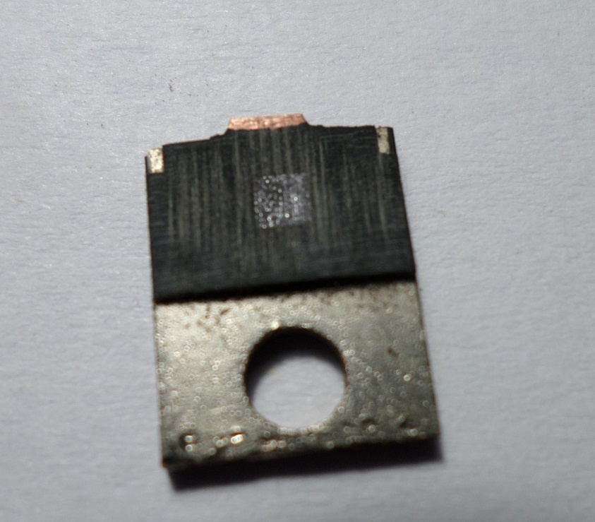 b)Compre dos si necesita uno. No tire el que saca del TV. llévelo a la amoladora o límelo sobre el encapsulado plástico, hasta llegar al chip y observe su tamaño. Mis alumnos dicen: si tenés dudas desnúdalo y compara la ropa interior. El tamaño del chip es proporcional a la potencia que puede disipar un MOSFET. Ahora efectúe el mismo procedimiento con el MOSFET que compró. La comparación visual ya nos indica el resultado de usar el MOSFET que le queda. Un chip más pequeño tiene mayor resistencia térmica y se calienta mas, aunque el disipador esté a la misma temperatura (resistencia térmica: es la facilidad que tiene un objeto en disipar su calor hacia otro cuerpo o al aire).
