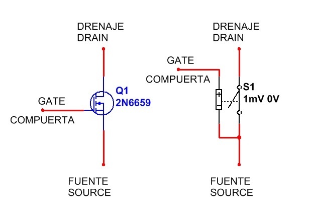 En la figura 2.1.2 se puede observar el circuito del MOSFET y su circuito equivalente, dibujado en un Multisim con una llave controlada por tensión.
